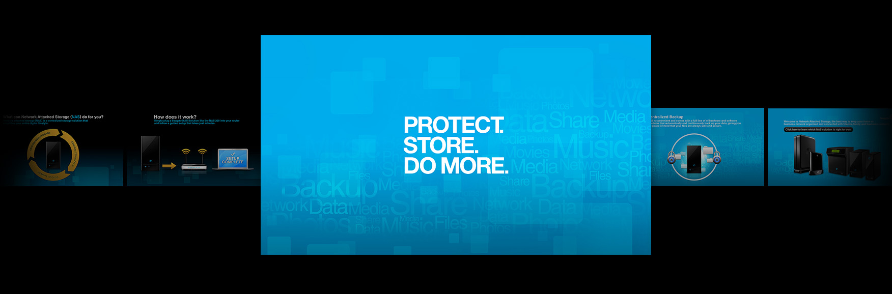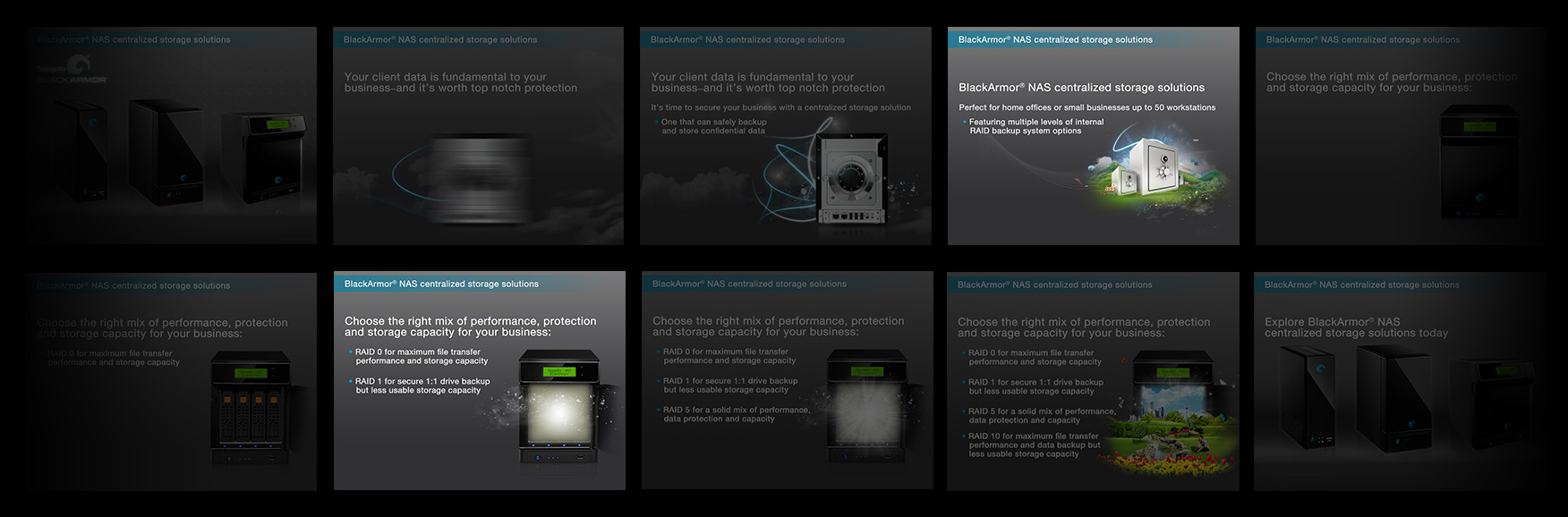 Seagate BlackArmor series drives needed some tender loving for their online launch so we created some nice viral presentations for the user to get the in depth specs behind what makes it such a great choice for external storage. Year: 2009 | Role: Art Direction, Design.
