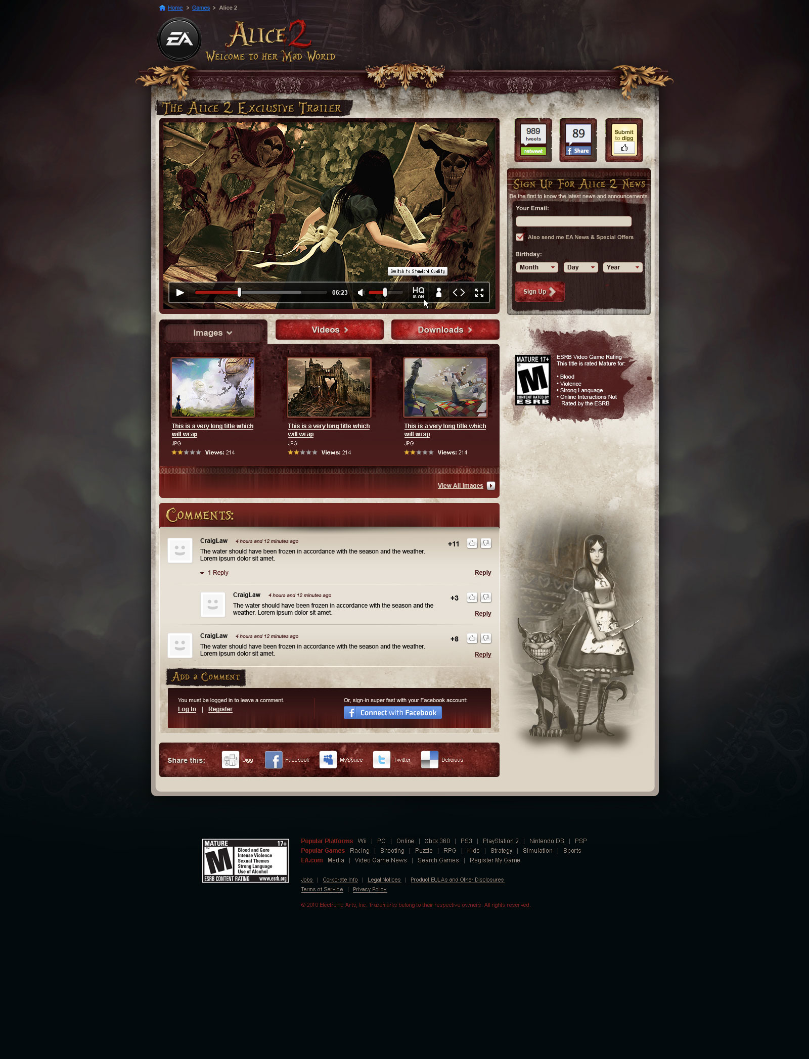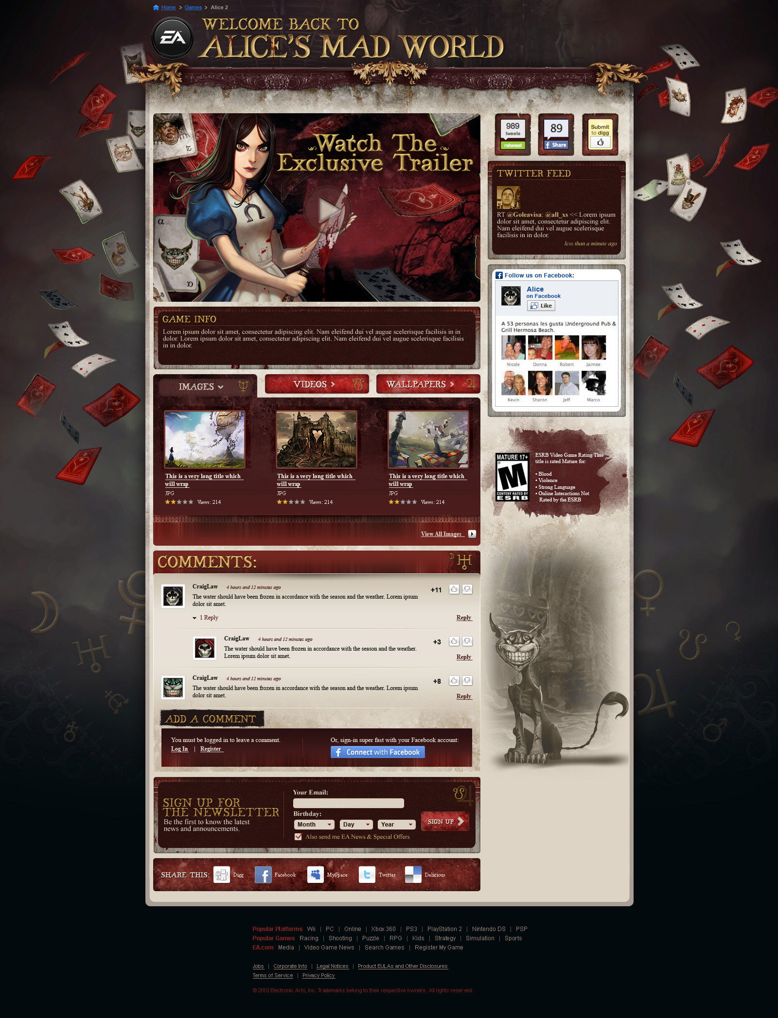 I was able to work with the EA Games creative team & G2 to create such a fun project. We wanted to create unique landing pages for the games launching in 2009. One of the first pages I was able to work on was Alice. Luckily the creative team at EA was able to supply outstanding concept art for the game, allowing us to emerge into a role and take on the feel of the adventure Alice went through in the game.